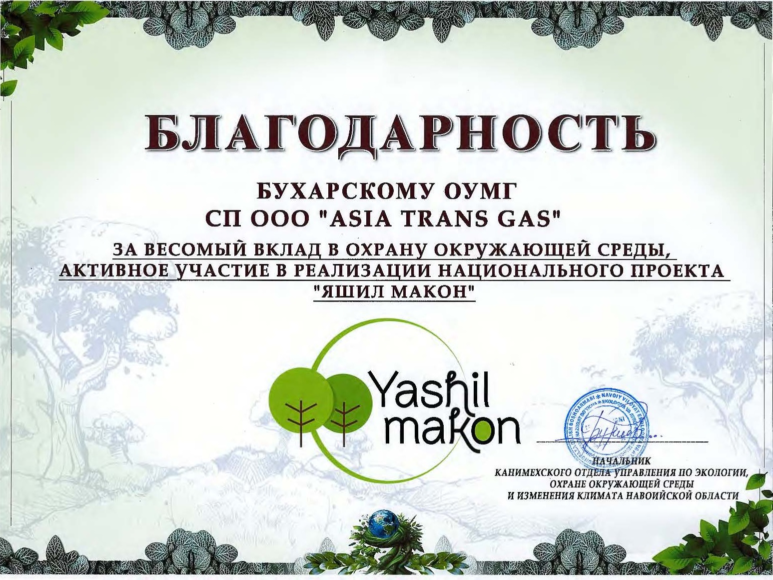 Коллектив Бухарского ОУМГ СП ООО "ASIA TRANS GAS" неоднократно был отмечен региональными управлениями по экологии, охране окружающей среды и изменению климата за весомый вклад в охрану окружающей среды. В декабре 2024 года за активное участие в реализации общенационального проекта «Яшил Макон» ATG было удостоено благодарственной грамоты за значительный вклад в охрану окружающей среды. Грамота была выдана и подписана начальником Канимехского отдела по управлению экологией, охраной окружающей среды и изменением климата Навоийской области